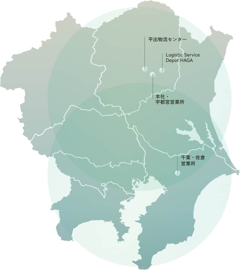 宇都宮市にある3箇所の倉庫・物流センターを中⼼としたネットワークを活⽤し、輸送・総合物流サービスを行なっています。全国配送にもに対応できる体制も整え、お客様の物流に関するニーズにワンストップでお応えするとともに、お客様の荷物を安全・迅速にお届けいたします。